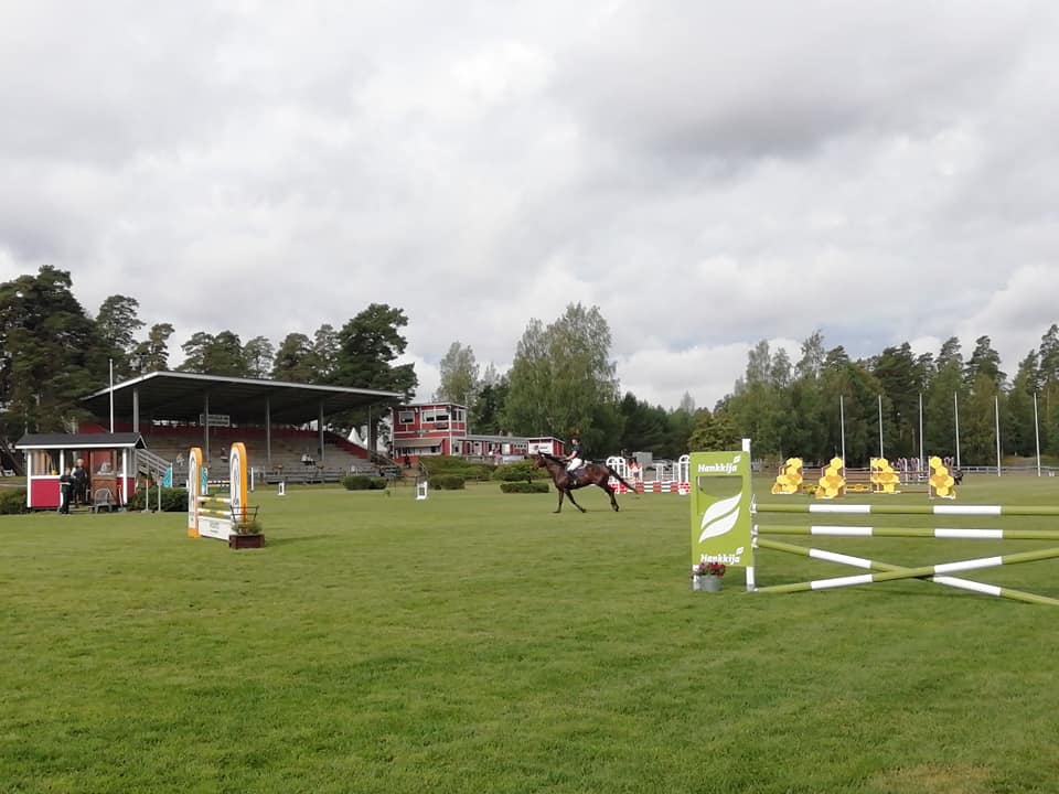 Alkurata oli ihan ok. Nelosen vesimatosta mentiin empimättä yli ja taisin huokaista vähän liikaa helpotuksesta sillä loppurata oli aikamoista räpöstelyä. Linjoilla asiat tulivat sitten aika nopeasti vastaan. Sarjalle olisi ollut loistavat mahdollisuudet pysähtyä. A juuresta, väli jäi pitkäksi ja loikkasi b:n kaukaa. Kuski ei ollut mukana hypyssä ja ohjatkin karkasivat. Nopeasti keräilin itseni ja käänsin seiskalle. Sekin ihan juuresta yli ja pakka jäi levälleen. Hemppa empi myös kasille eikä ahkera patisteluni auttanut kun askel ei osunut. Hemppa pysähtyi. Kuskin kommentti: "et oo tosissas!" Voltatessa ehti käydä kauhuajatukset mielessä että jos nyt kieltää niin ei päästä huomenna maastoon. Onneksi päästiin toisella kerralla yli eikä tullut edes aikavirheitä! 4 vp rataesteiltä siis ja pudottiin tuloksissa pykälä alemmas kymmenenneksi. 9,4 pistettä kärjestä ja lähes saman verran ruusukkeista.